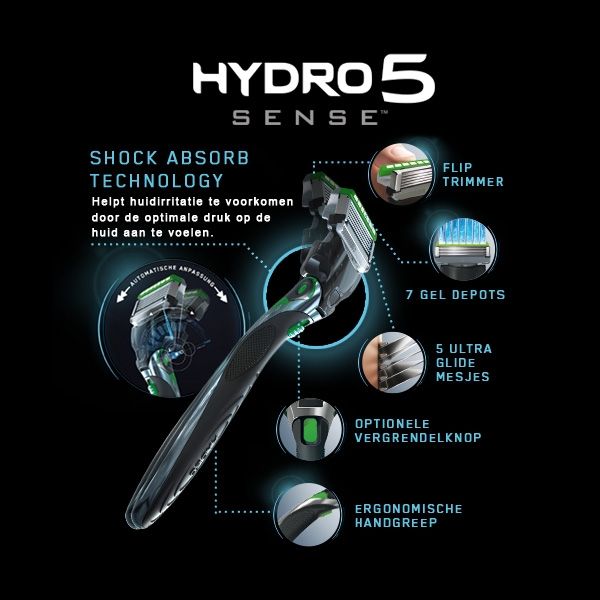 Het nieuwe Wilkinson Sword Hydro 5 Sense houder met unieke schok absorberende technologie. De Wilkinson Hydro5 Sense scheermesjes helpen huidirritatie te voorkomen door de optimale druk op de huid aan te voelen Optionele vergrendelknop Indien nodig kan de schok absorberende technologie uitgeschakeld worden. 5 UltraGlide mesjes De innovatieve Skin Guards controleren het contact met de huid via de 5 UltraGlide mesjes en verminderen de wrijving op de huid. Flip Trimmer Scheren met precisie op de moeilijk bereikbare plekjes. 7 Gel depots Gel depots met gel die de huid bedekt als een beschermend laagje en zorgt voor moeiteloos glijden. Ergonomische handgreep De anti-slip coating zorgt voor een eenvoudige bediening en controle. Geschikt voor elk huidtype De innovatieve comfort gel met kruidenextracten kalmeert de huid.