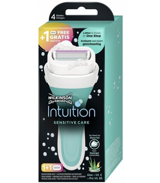 Het Wilkinson Sword Intuition Sensitive Care scheersysteem doet al het werk voor jou. Scheergemak gecombineerd met hydratatie! Intuition Sensitive Care, verrijkt met 100 % natuurlijke Aloe Vera, Vitamine E en B5, revitaliseert en verzorgt. De vier ultradunne mesjes zijn omhuld door een zachte, romige zeep die je huid verzorgt en hydrateert tijdens het scheren. Je huid was nog nooit zo zacht. Je hebt geen zeep, scheergel of bodywash meer nodig en bespaart kostbare tijd.