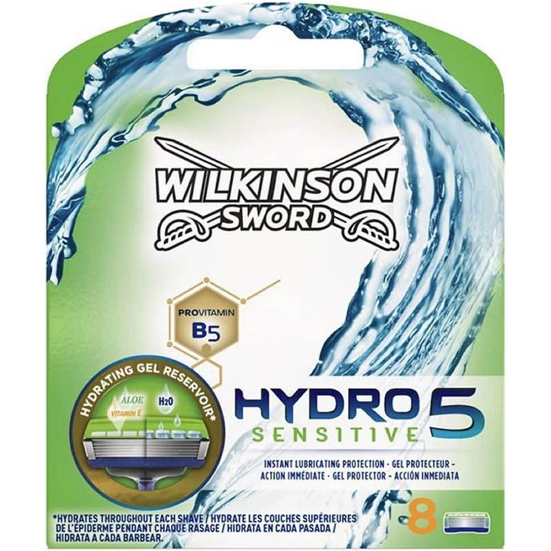 Wilkinson Hydro 5 Sensitive 8 mesjes De Hydro 5 scheermesjes is een scheersysteem met 5 mesjes van Wilkinson Sword voor de gevoelige huid! Dit scheersysteem bevat ook een gel reservoir met vitamine B5 zodat de huid tijdens het scheren wordt gehydrateerd. De Wilkinson Hydro5 bevat 5 Ultra Glide mesjes, waarbij extra contactpunten huidirritatie voorkomen en zorgen voor een optimaal scheerresultaat. Als extra innovatie heeft de Hydro5 een fliptrimmer; dit is een extra toevoeging aan het scheermesje voor moeilijk bereikbare plaatsen en een verfijnde afwerking.
